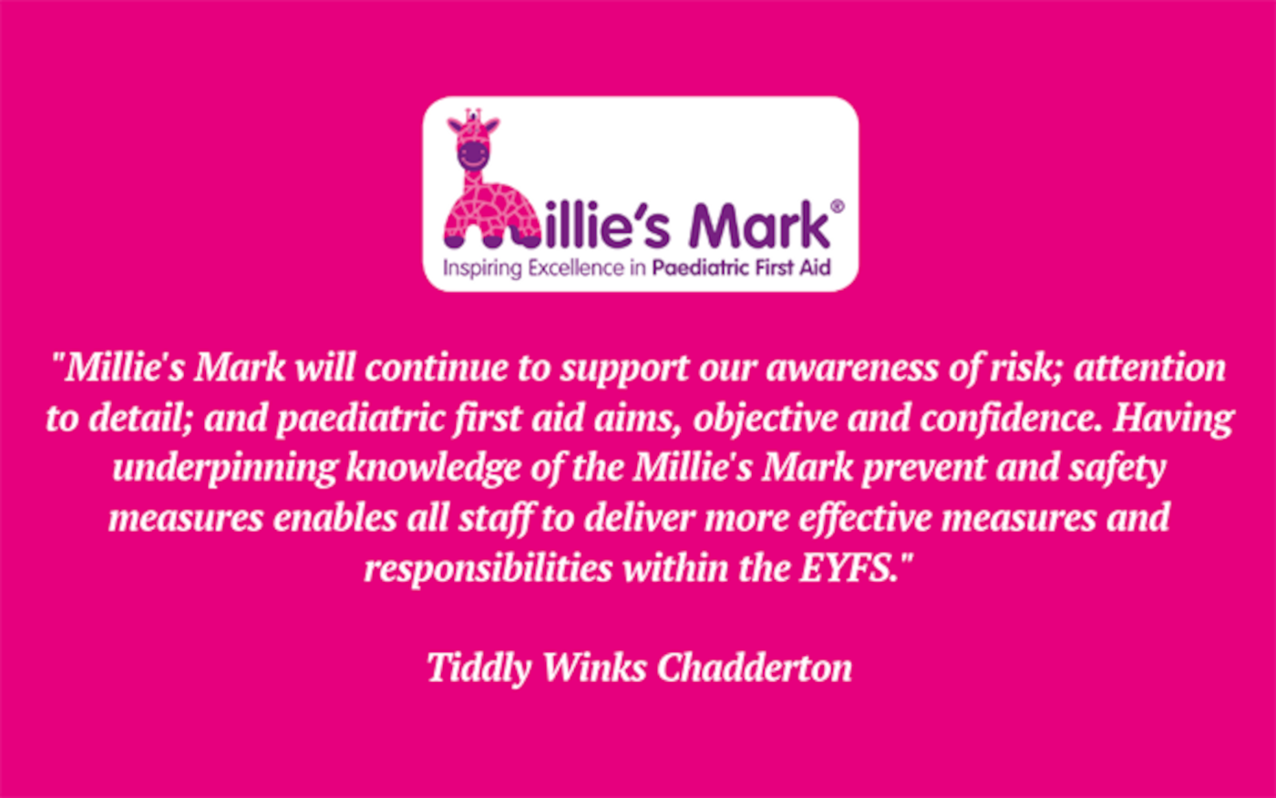 Millie’s Mark will continue to support our awareness of risk; attention to detail; and paediatric first aid aims, objective and confidence. Having underpinning knowledge of the Millie’s Mark prevent and safety measures enables all staff to deliver more effective measures and responsibilities within the EYFS.